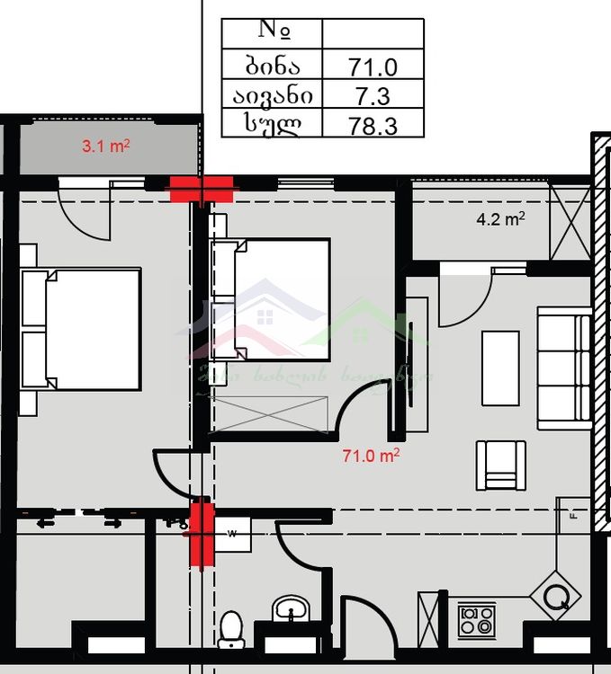 ბინა მდებარეობს 15 სართულიანი კორპუსის მე-4 სართულზე და მოიცავს 78 კვ.მ ფართობს.